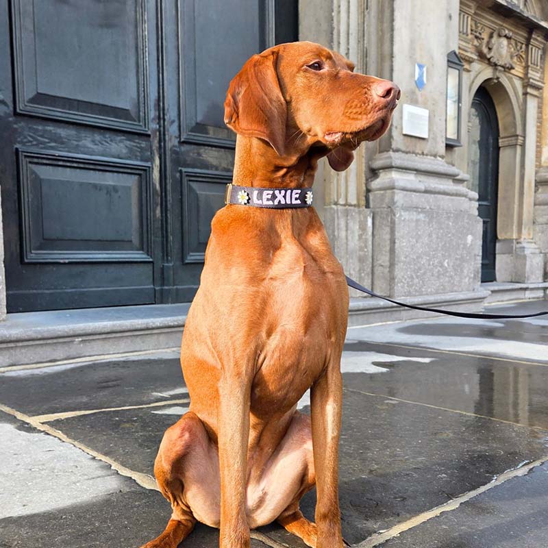 Lightweight, safe, and comfortable while matching personality. Want to add pins? Combine a Puppy collar with a Classic leash size M for a cute twist.