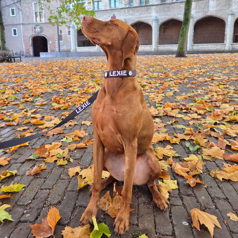 De set hals -en leiband is echt magnifiek mooi! Ontzettend leuk dat je zelf het lettertype en de kleuren mag bepalen. Gepersonaliseerd en uniek op en top! De kwaliteit is erg stijlvol en de kleuren zijn geweldig! De verzending is super vlot gegaan en wij zijn erg blij met deze prachtige wandelset 🥰 5***** waardig!!!! Jill & Pippa